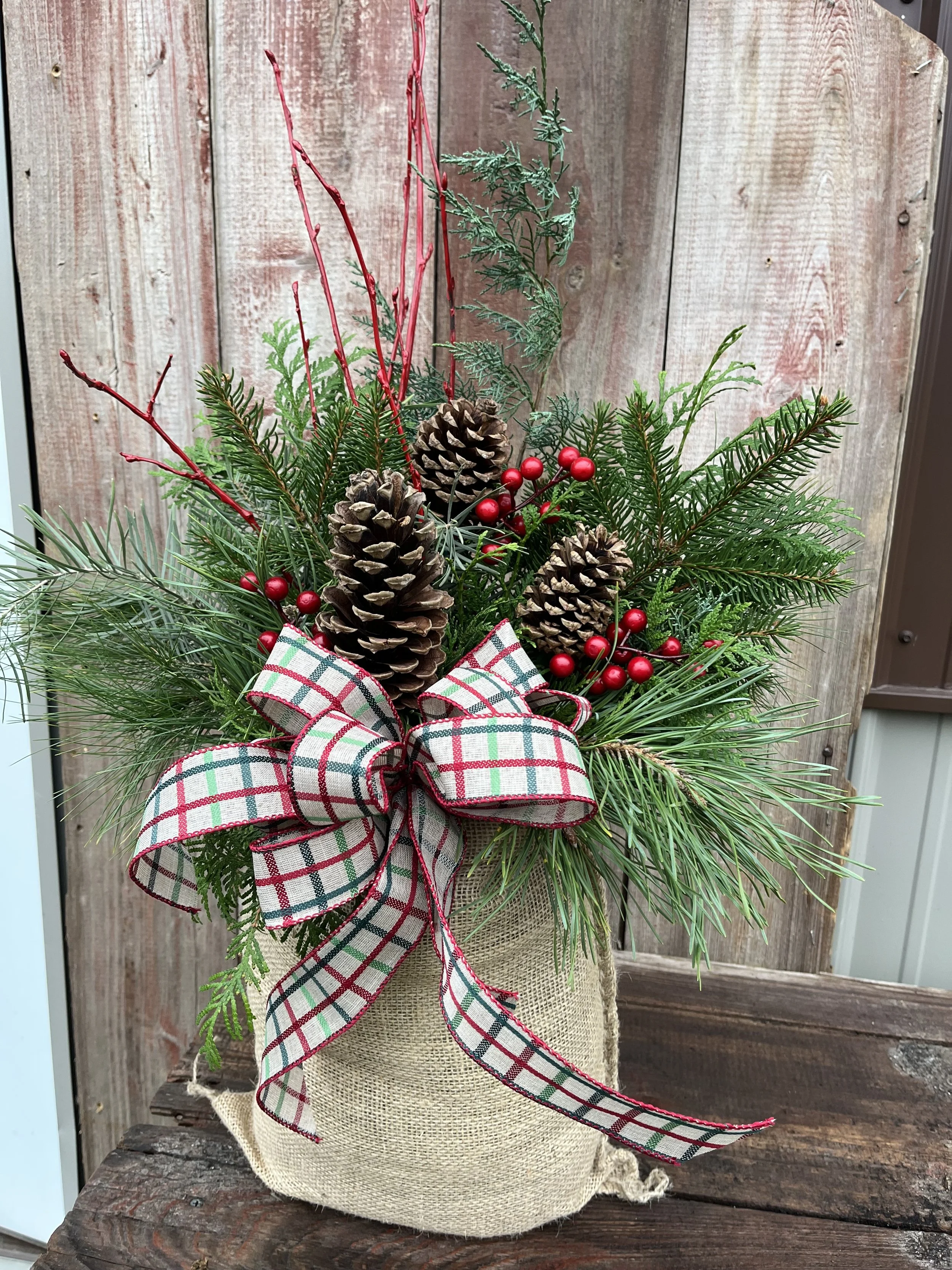 Decorated with pinecones, branches, weatherproof artificial berries and natural plaid bow